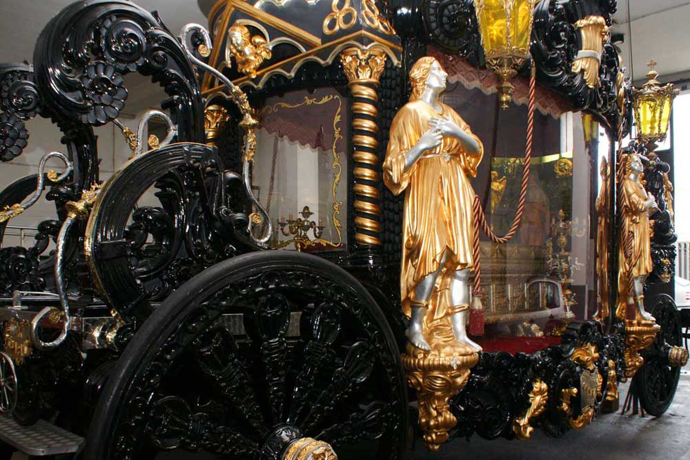 - 5 coches fúnebres monumentales con adornos artisticos en madera remolcados por cabllos neerlandeses;